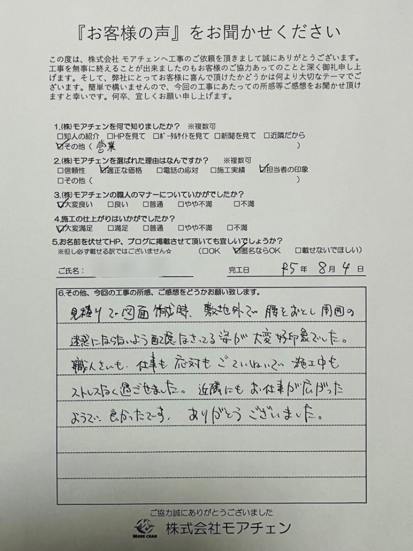 職人さんも、仕事も応対もごていねいで施工中もストレスなく過ごせました。